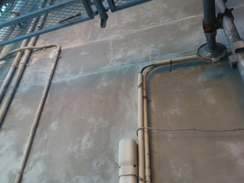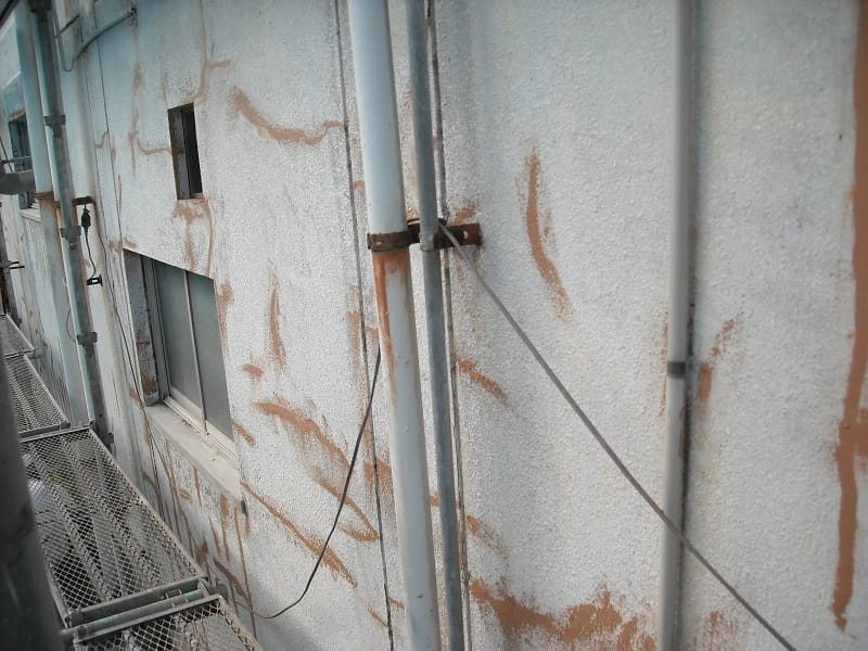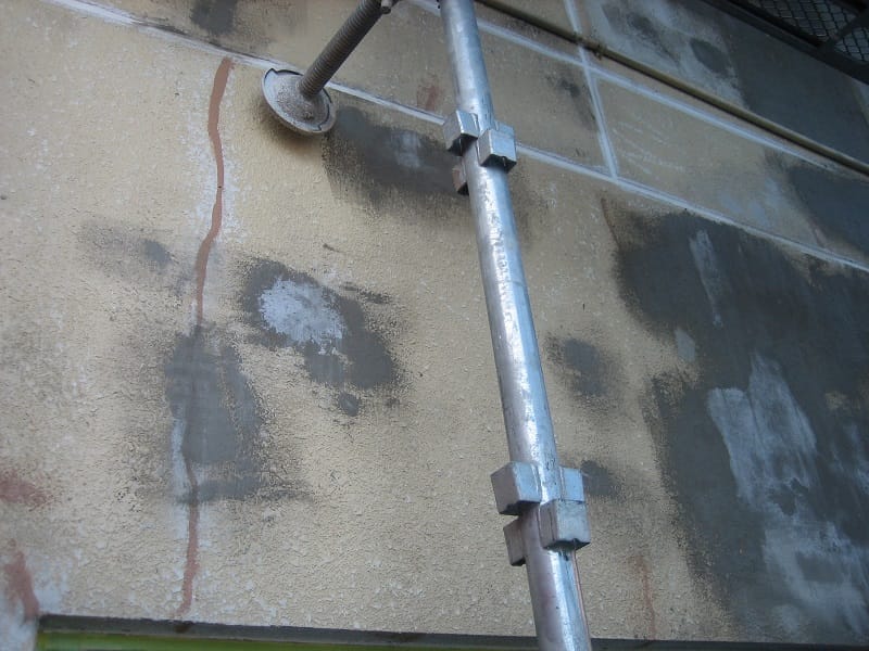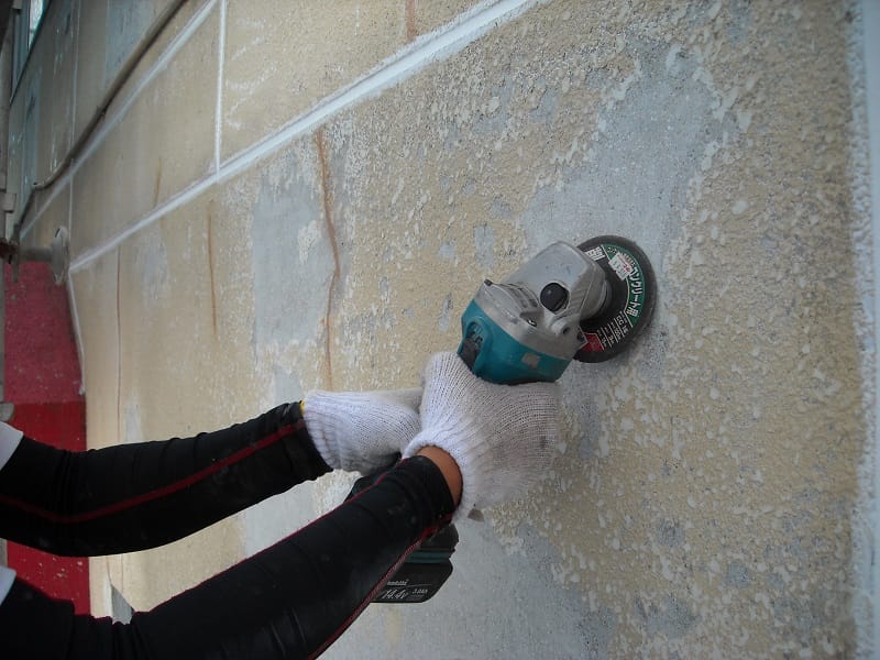 ①劣化により塗装が剥離した壁面をサンダー掛けしています。