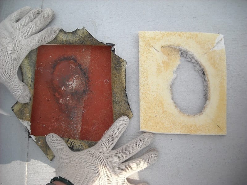 お客様からのご要望 既存の防水シートの劣化により、雨漏りがしていました。コーナー部分は完全に剥がれて浮いています。(施工前写真①)また、平面のシートも表面の防水機能が失われています。(施工前写真②)