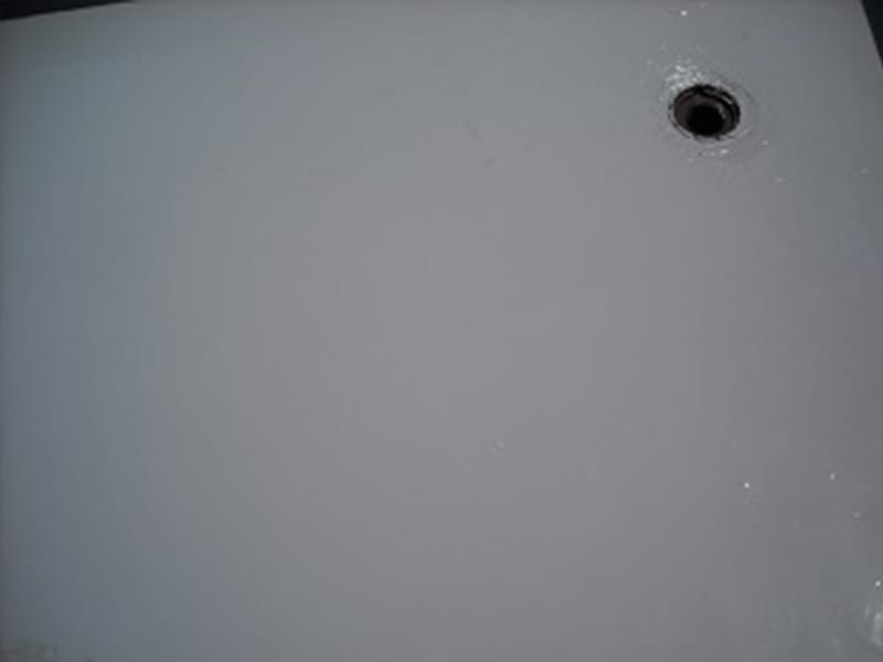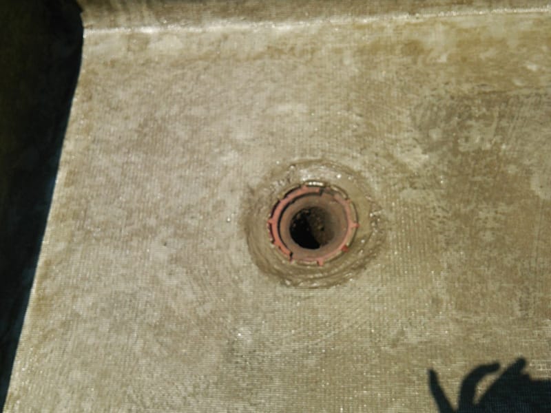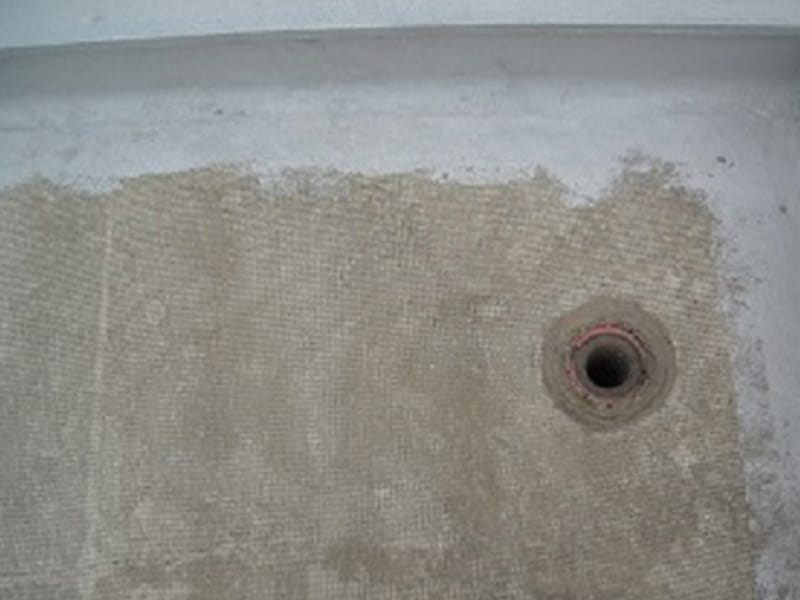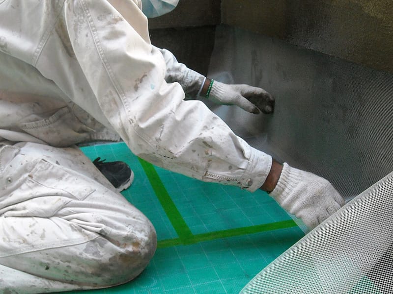 ⑨補強布張り 排水溝廻りも丁寧に行います。